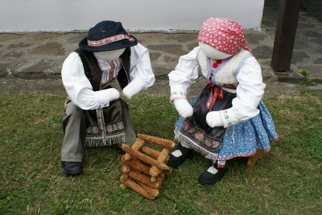 村の民俗衣装の人形:とうもろこしの芯で作っているのはキャンプファイヤではなく、ホッローケーの城塞